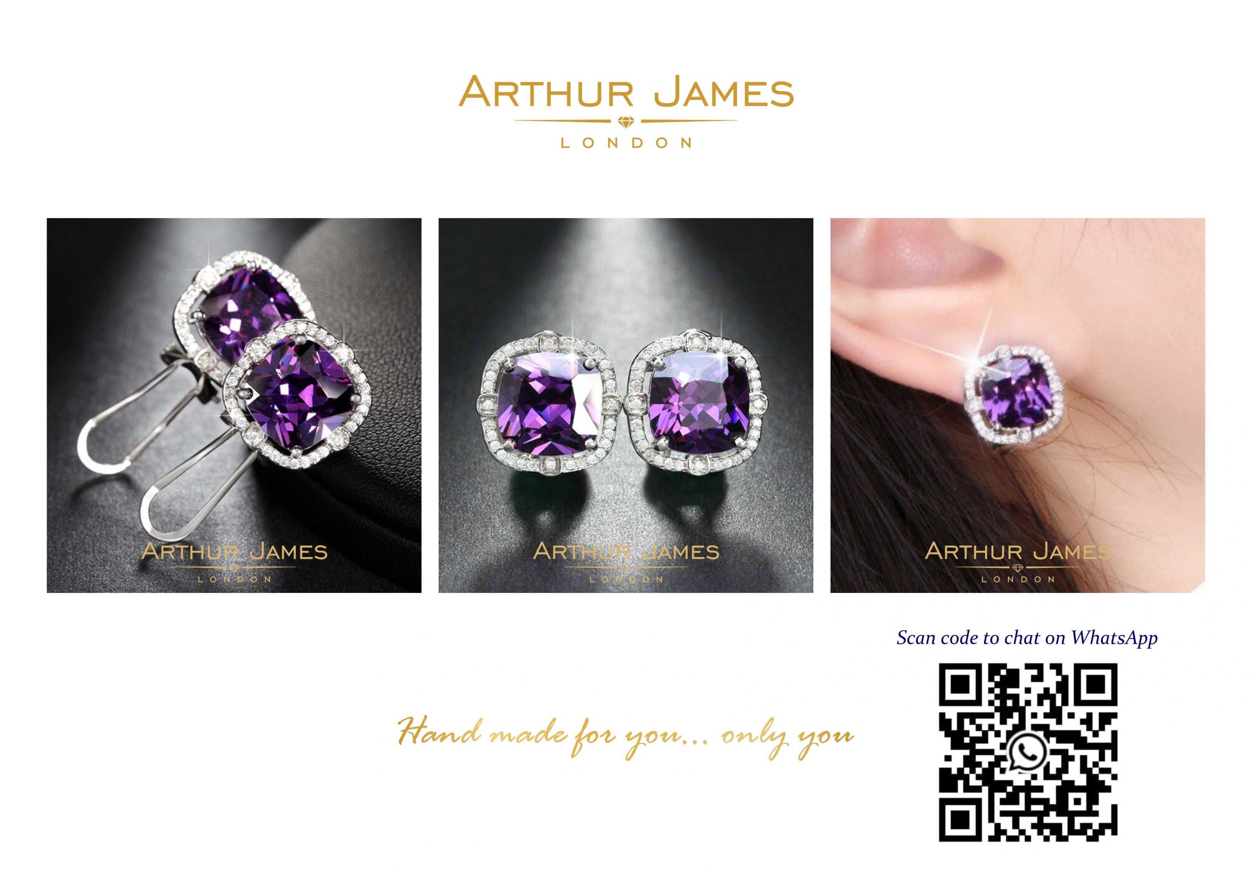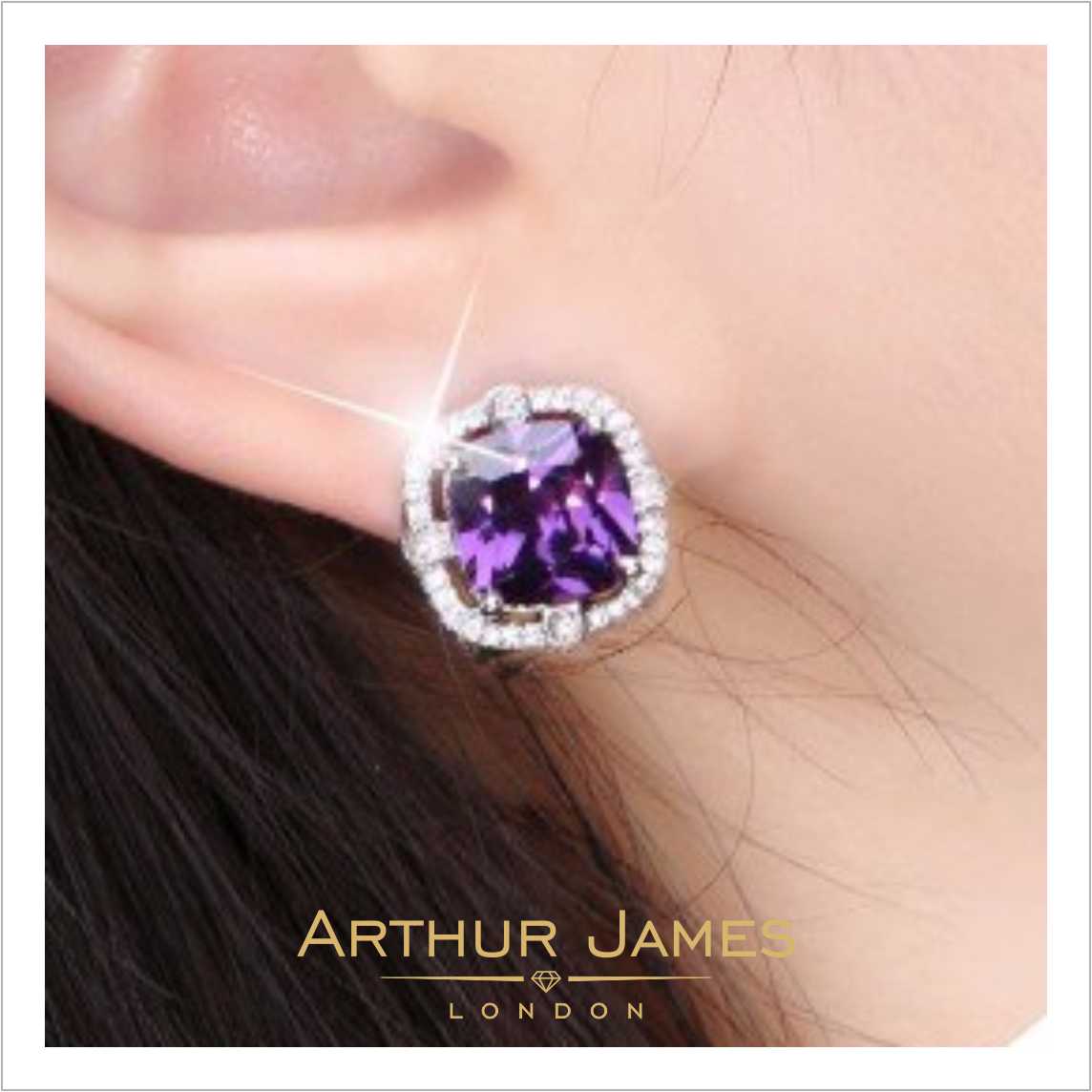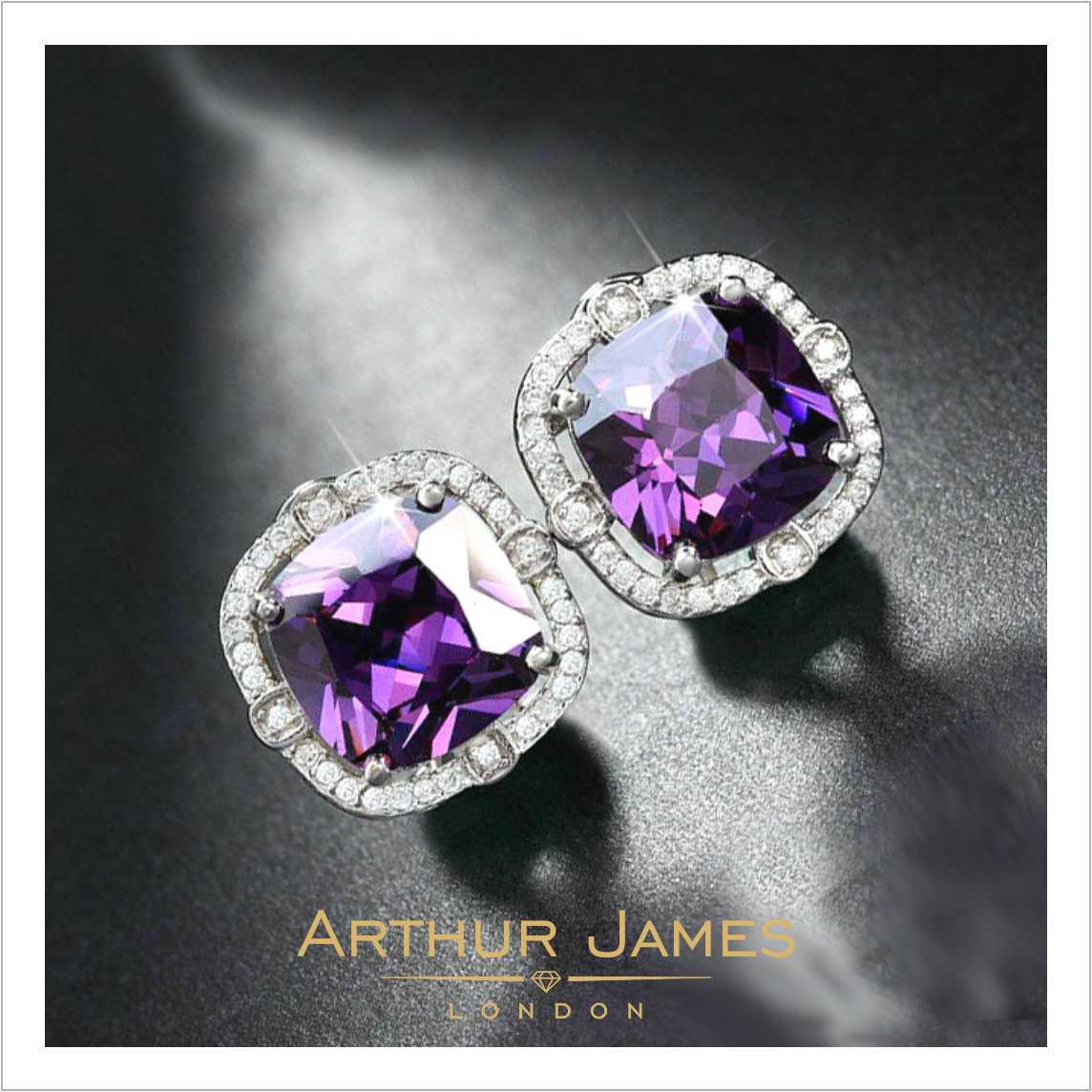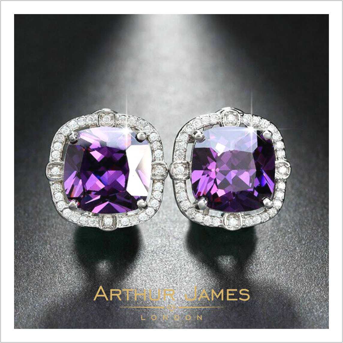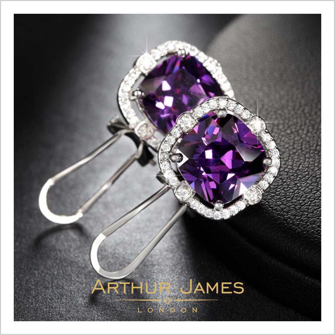 • Cushion-cut Purple Amethyst diamond omega drop earrings